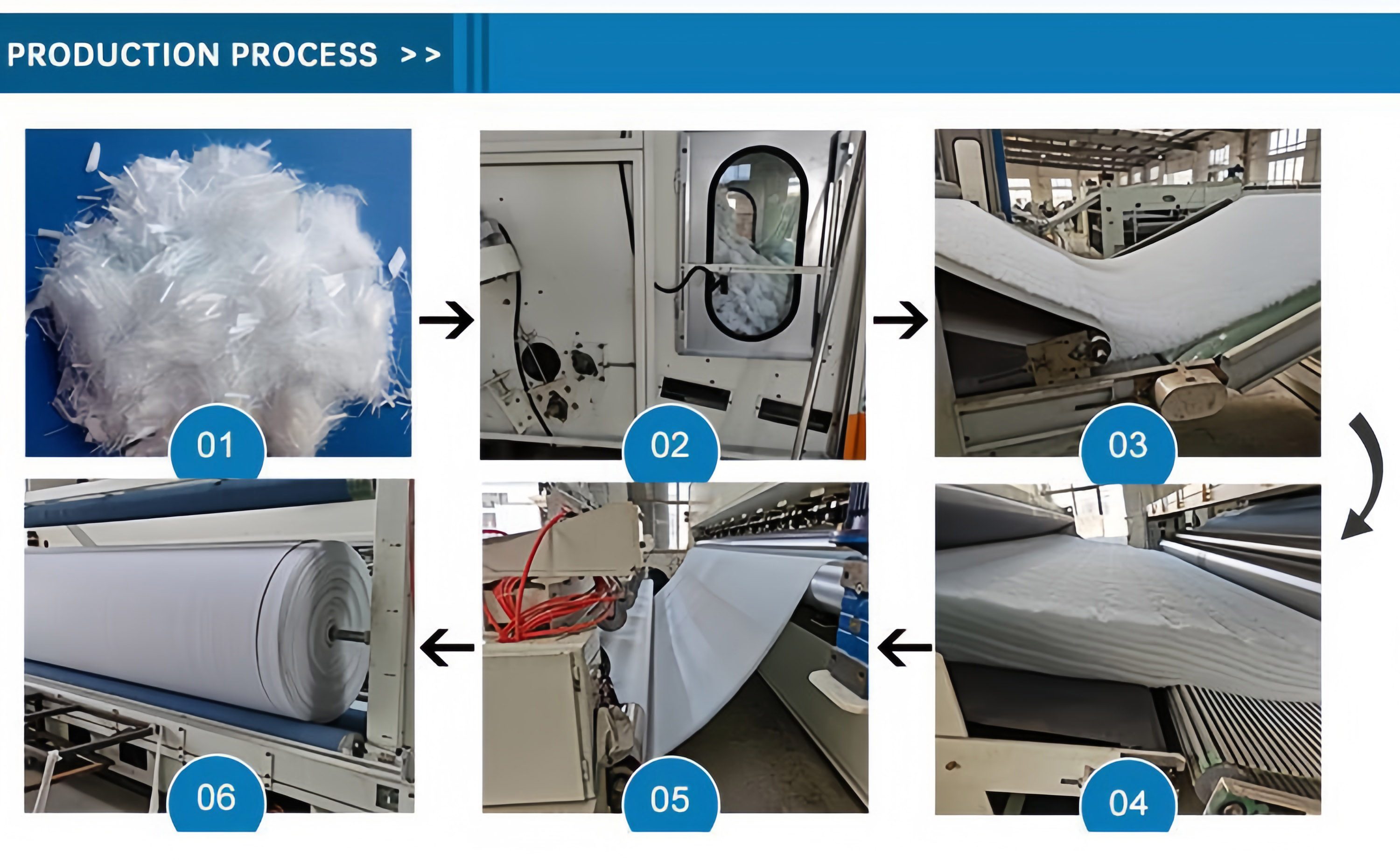 2. Acupuncture and compounding: A acupuncture machine is used to pass the needle through the upper geotextile, sodium-based bentonite and the lower geotextile. The needle barb scrapes off the upper geotextile fiber, and the fiber is left between the two geotextiles after the needle is returned to complete the acupuncture and compounding.