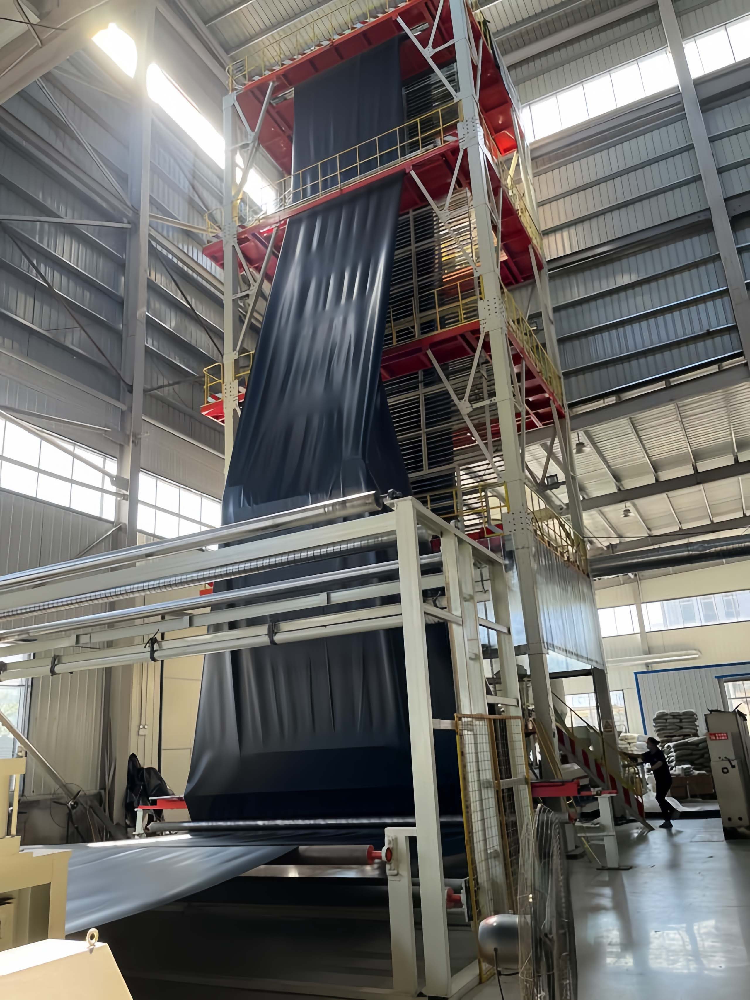 Generally, there are two types of geomembrane production processes, laminating and calendering process and blow molding process. The thickness specifications are commonly used in (0.2mm~3.0mm), and blow molding can be 0.03mm.The film thickness size of the blow molding process is more stable than that of the calendering process, and some urban construction indicators with strict engineering indicators are produced in the blow molding process.